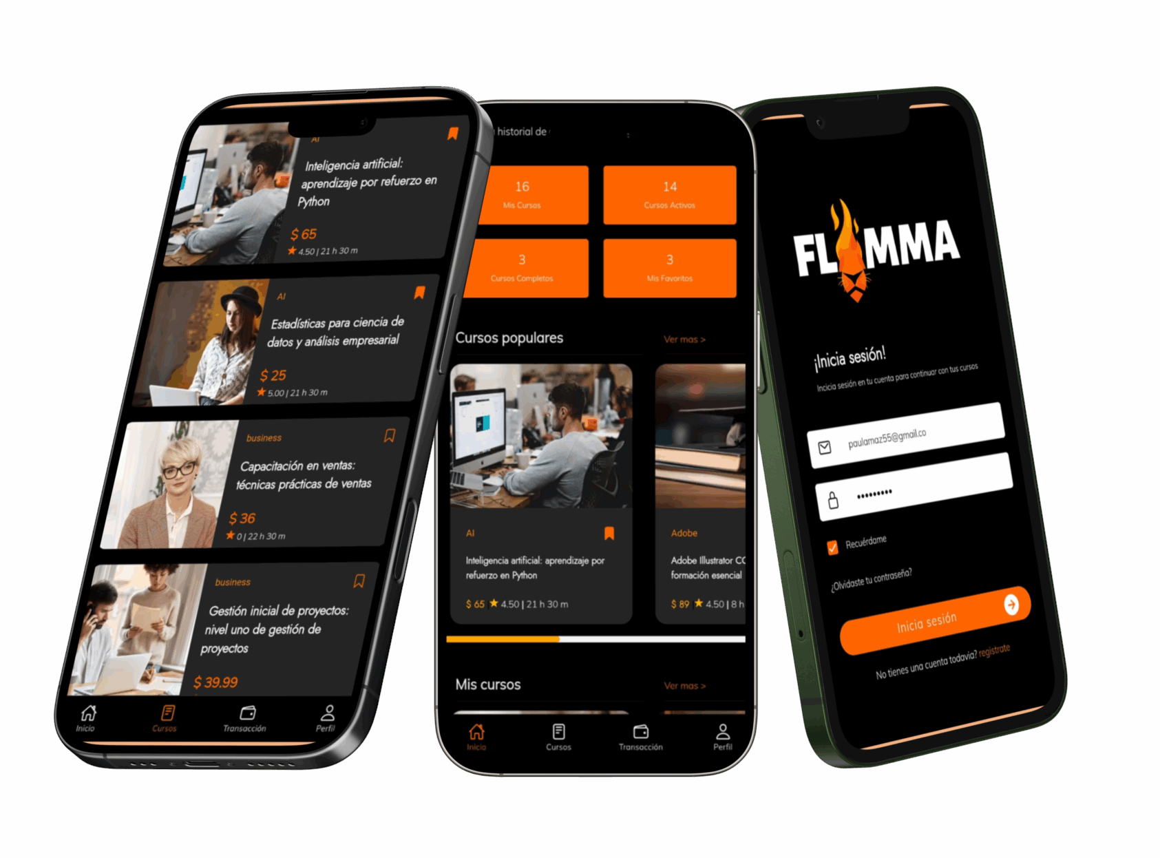 FlammaNXT es una aplicación móvil educativa diseñada para optimizar la experiencia de aprendizaje digital. Ofrece un ecosistema completo que integra registro seguro, perfiles de estudiantes y docentes, exploración de cursos, inscripción en línea y acceso a contenidos interactivos.