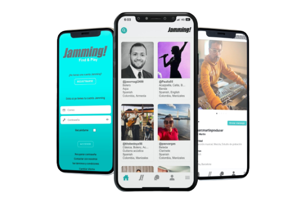 Jamming es la primera plataforma gratuita que conecta a profesionales y aficionados de la industria musical. Disponible en versión web y aplicación móvil, permite que músicos, grupos y servicios se encuentren y colaboren fácilmente. Con tres tipos de perfiles: músicos, bandas y proveedores.